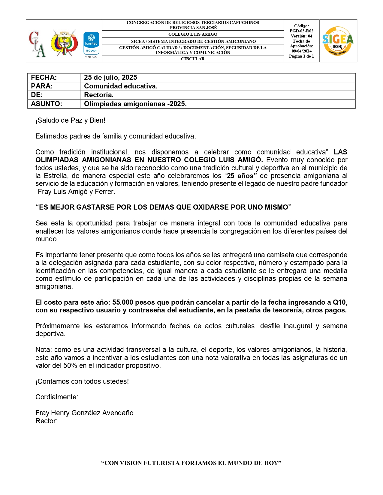 ¡Saludo de Paz y Bien! Estimados padres de fam...