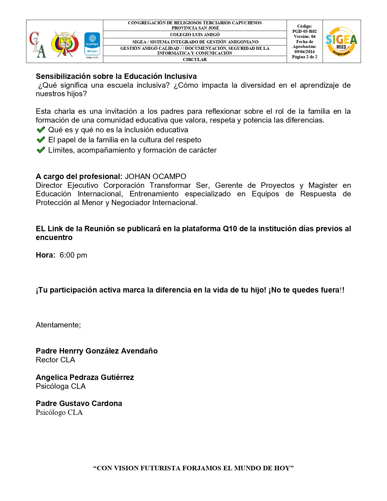 La institución educativa Colegio Luis Amigó les hace llegar la información pertinente para la escuela de padres que se realizará el próximo 03 de julio.