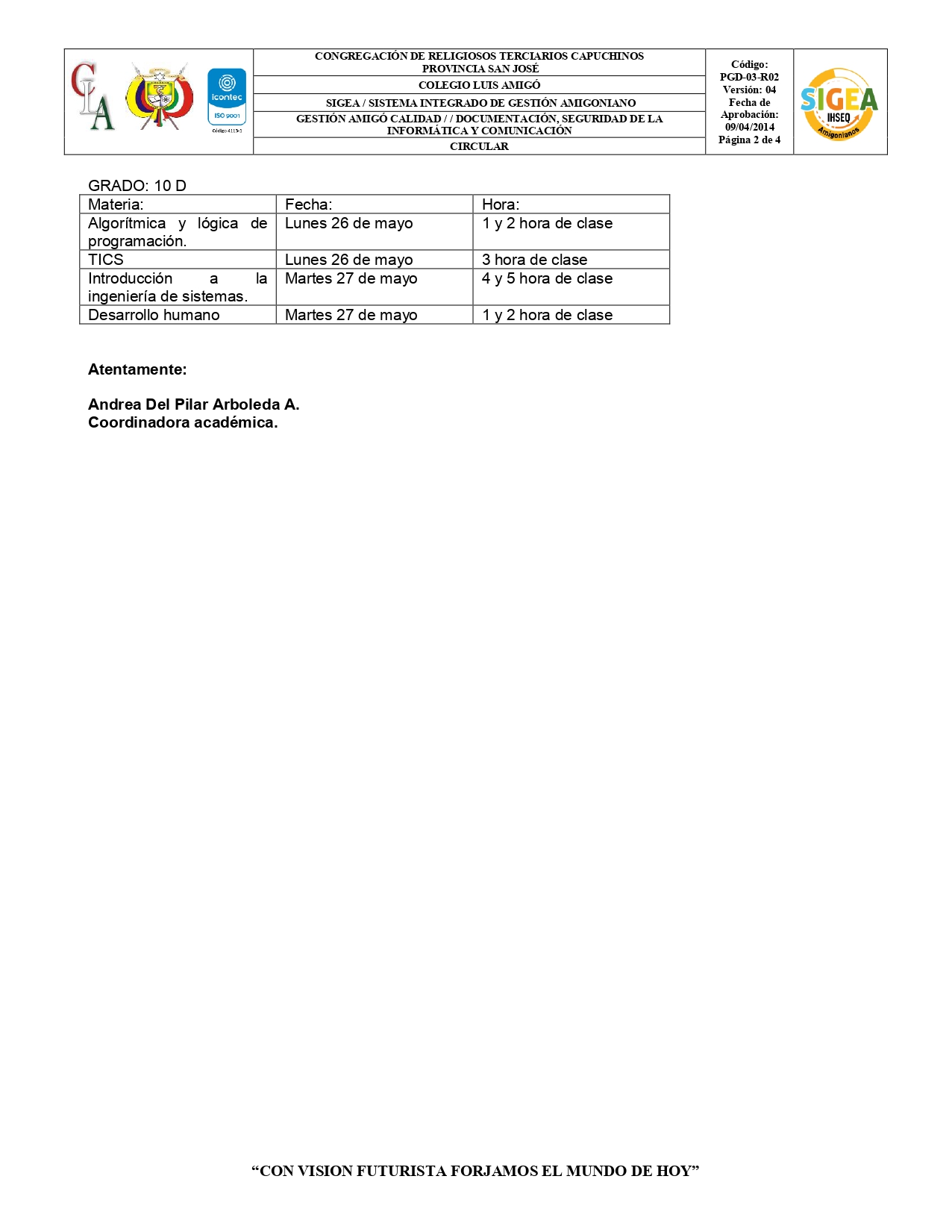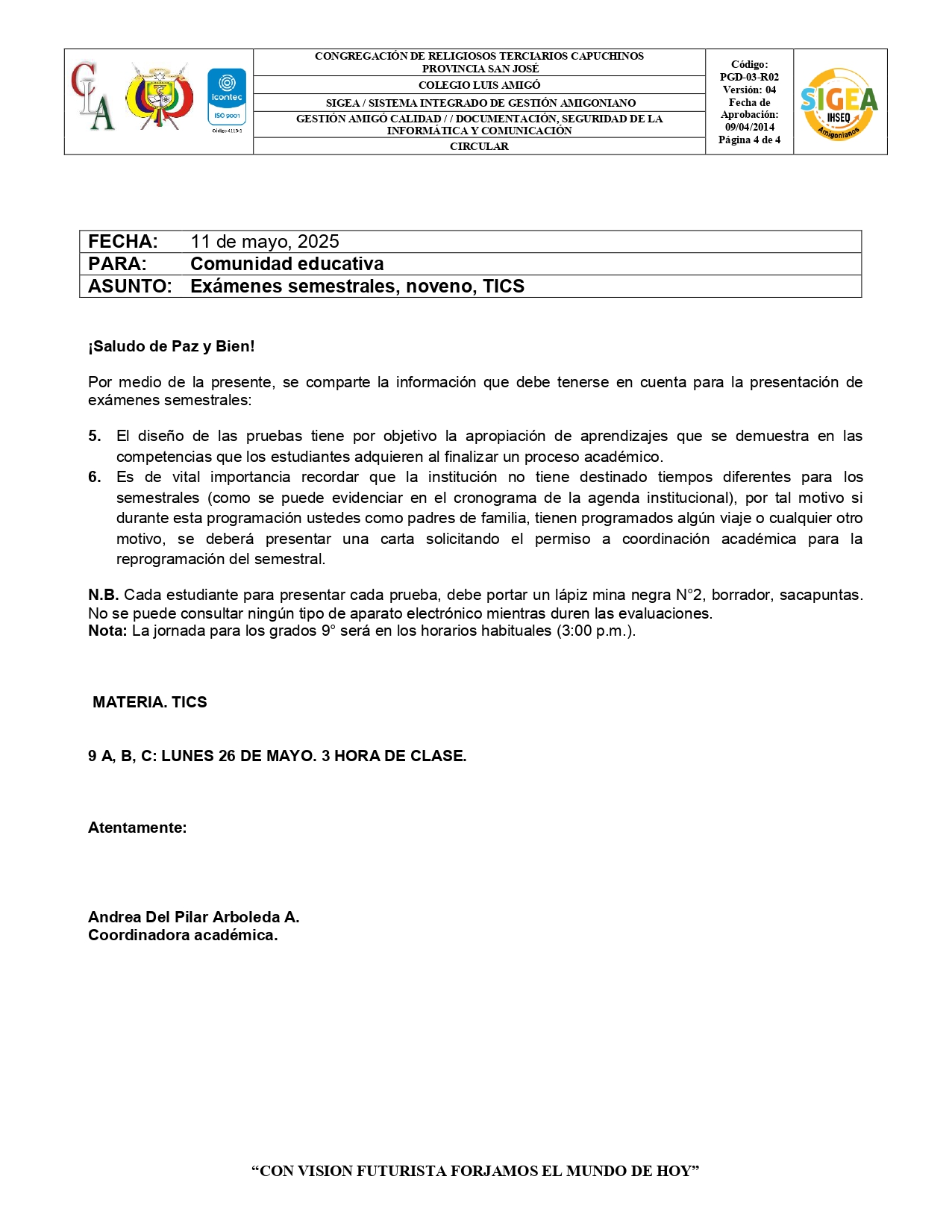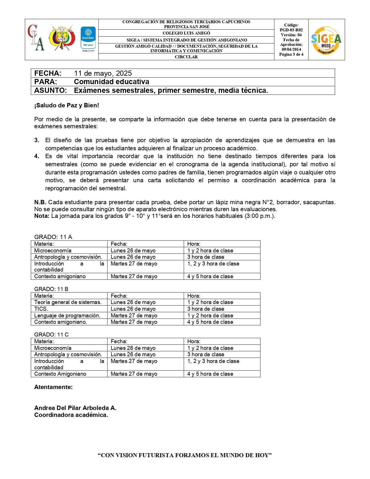 ¡Paz y Bien! La institución educativa Colegio Luis Amigó les hace llegar el cronograma de evaluaciones semestrales correspondientes a las técnicas. Favor tenerlo en cuenta.