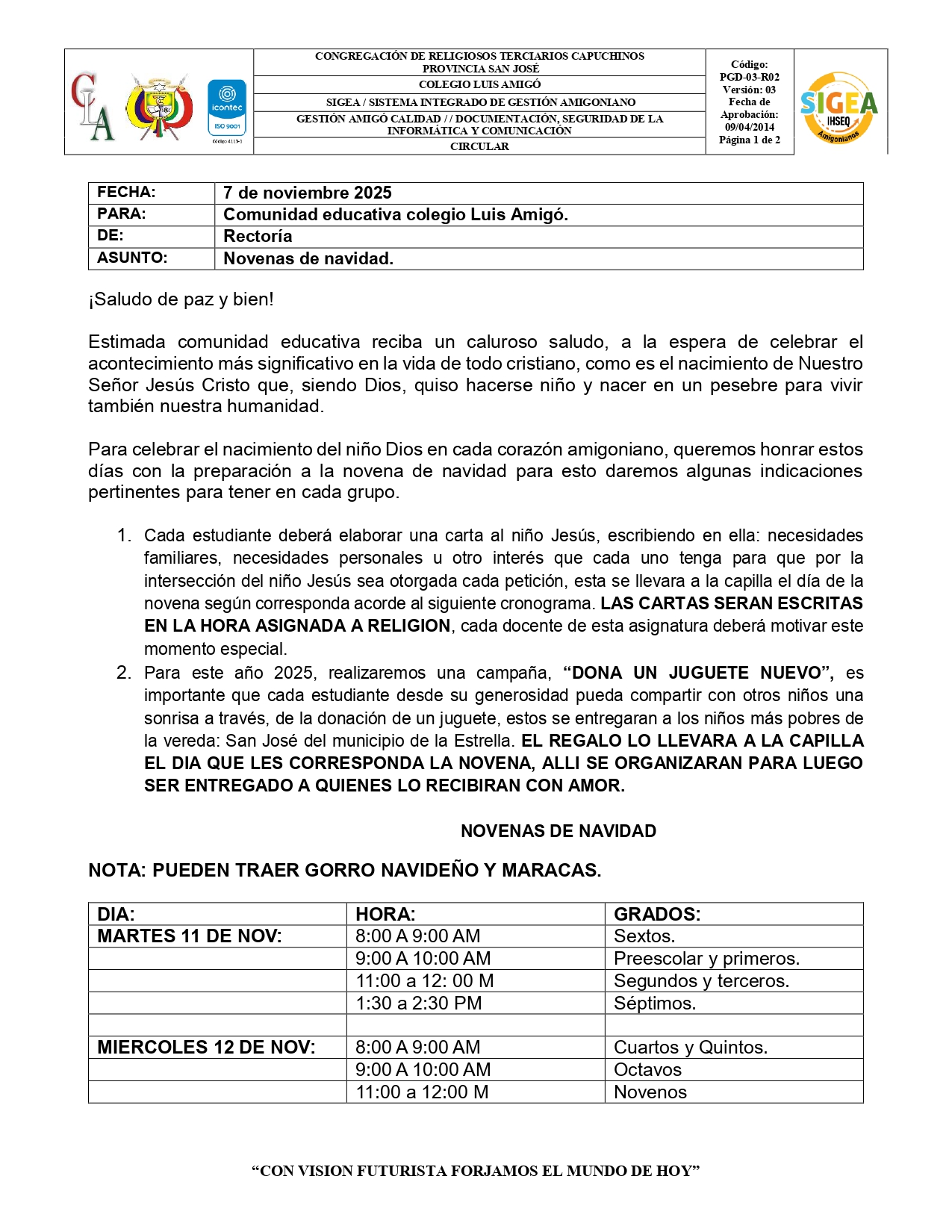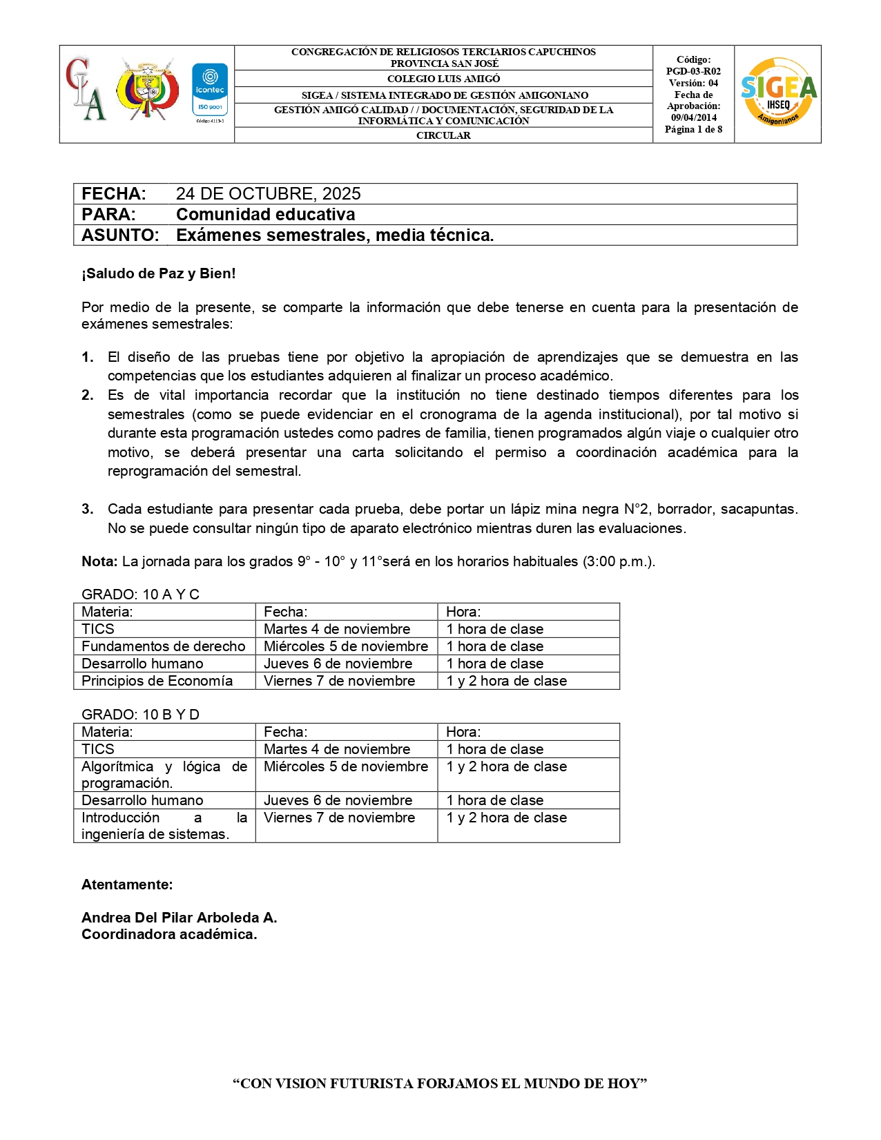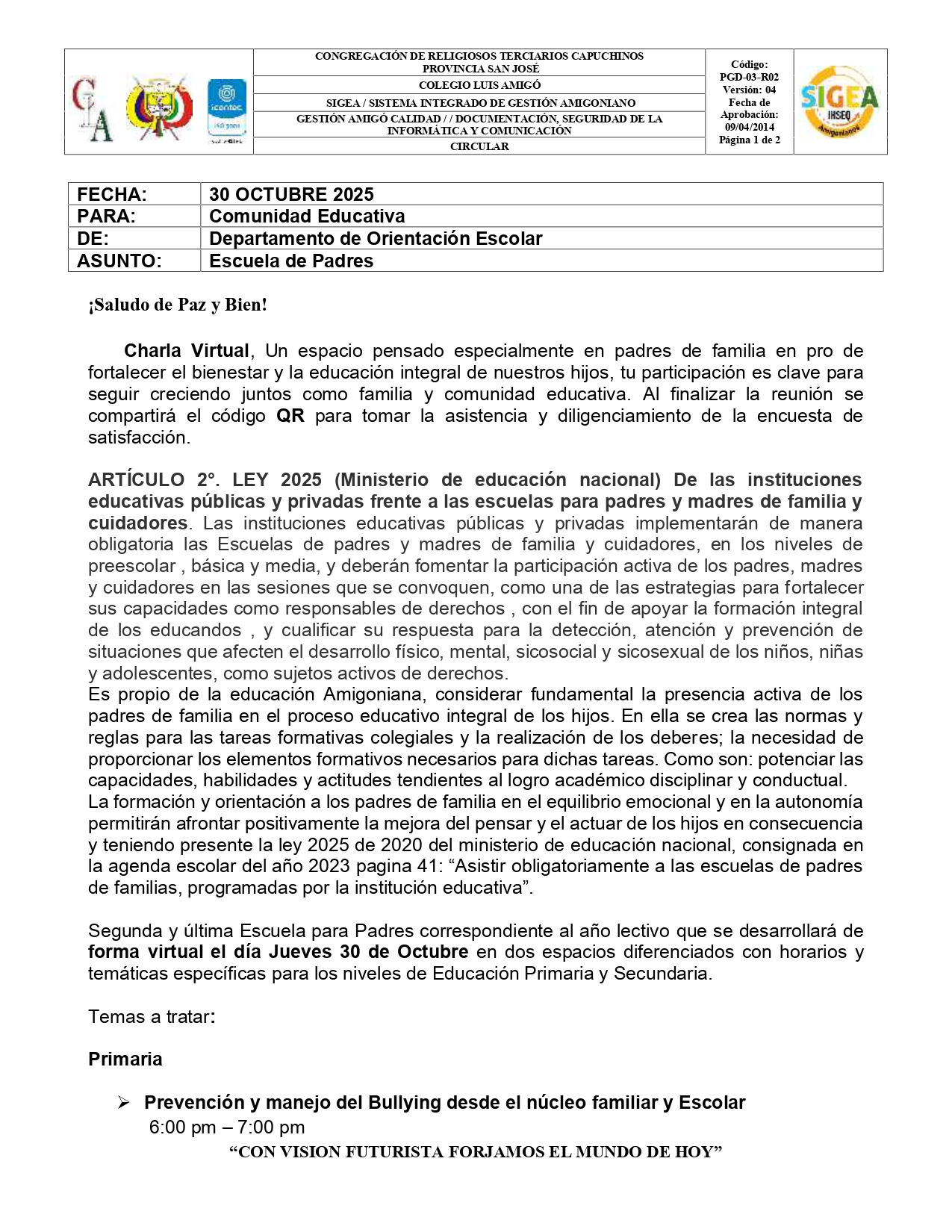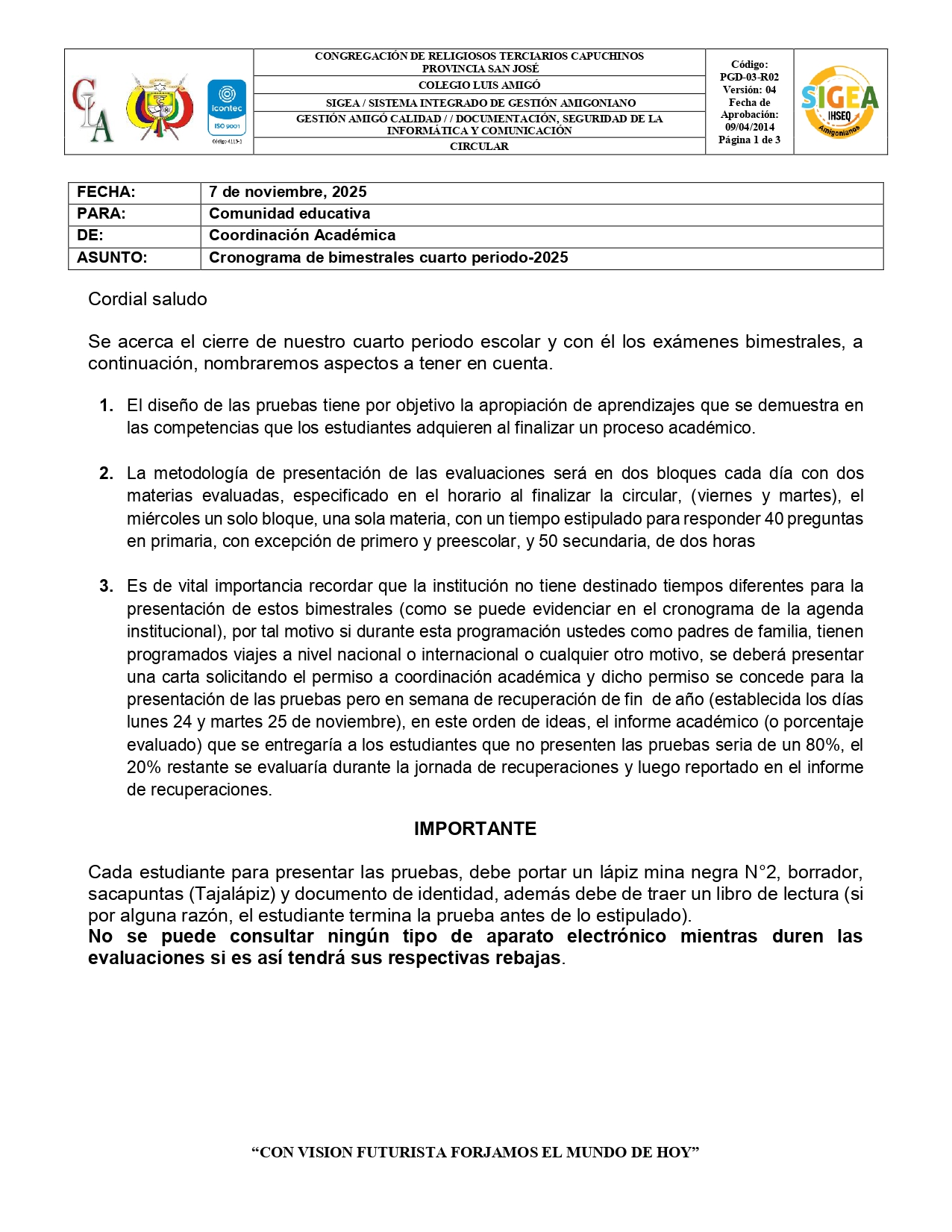 el Colegio Luis Amigó les da la bienvenida y abre sus puertas para las admisiones del año lectivo 2025 a partir del 2 de julio.