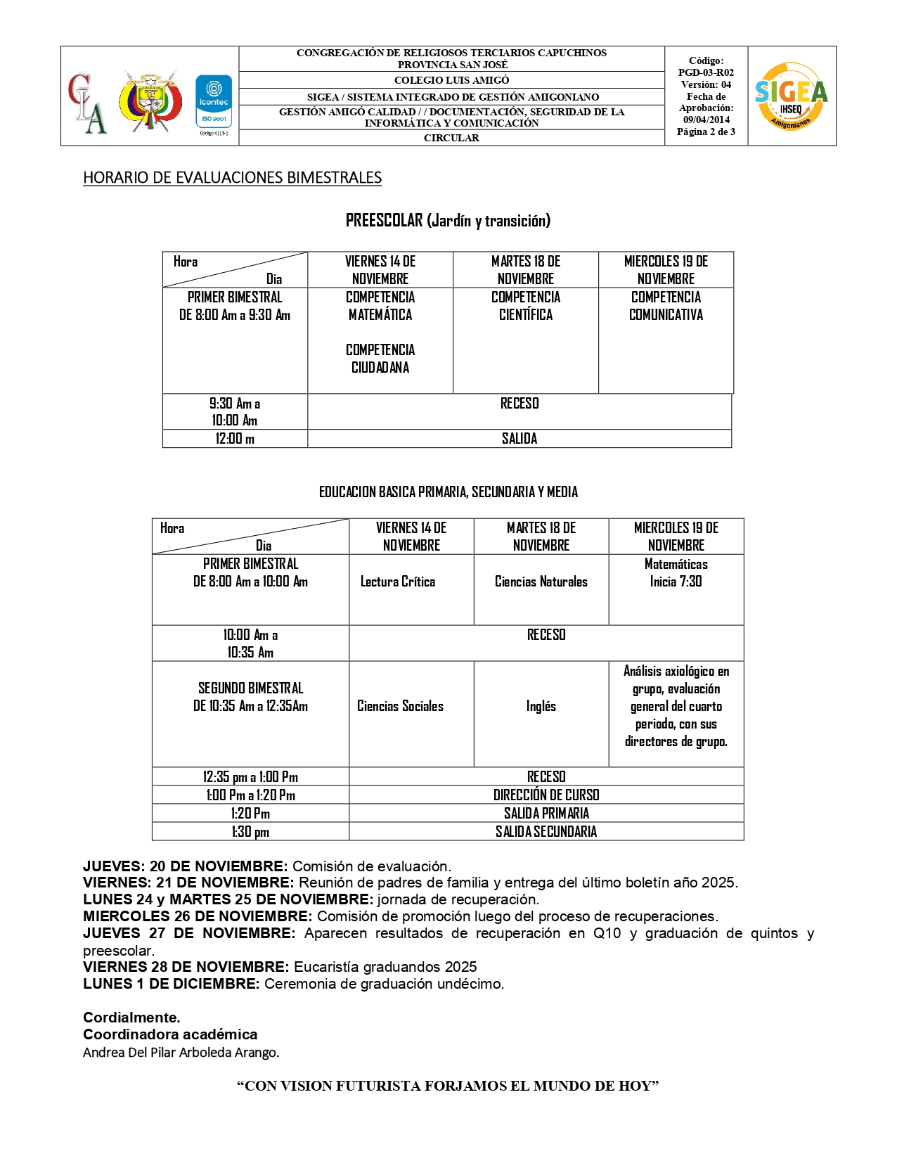Como es sabido, estamos ad portas del final del año escolar y queremos invitarlos a que se informen sobre fecha y hora de los bimestrales de último periodo.